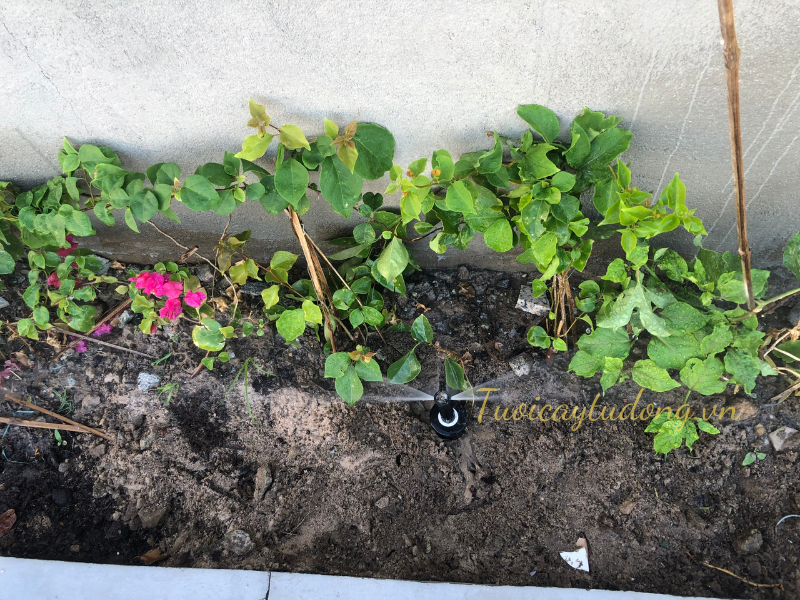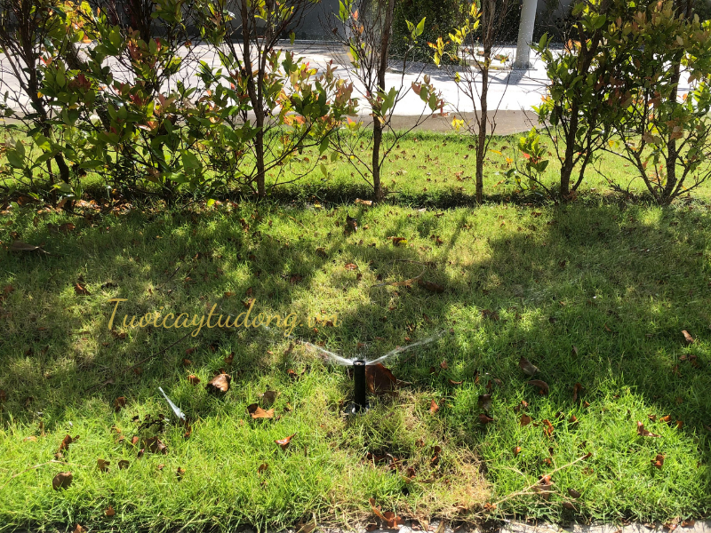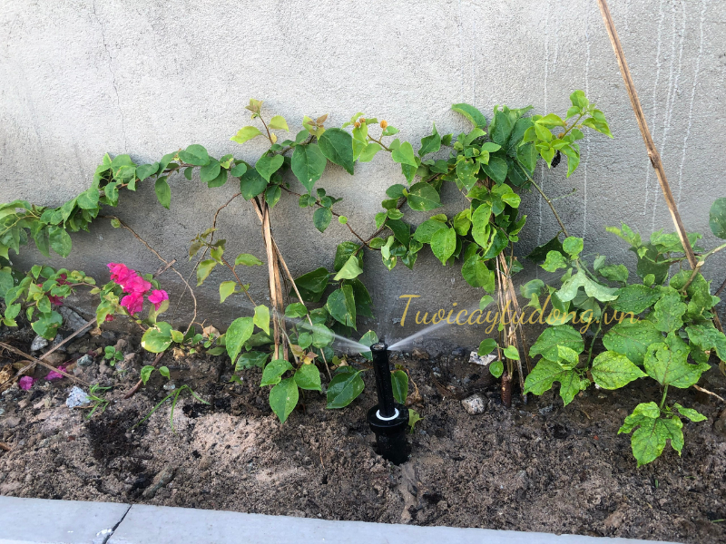 Thi công lắp đặt béc tưới phun mưa hình chữ nhật cho cây bụi, cây tạp dọc tường rào, lối đi