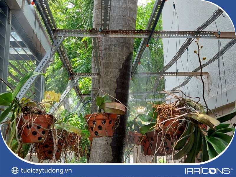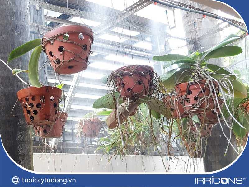 Toàn cảnh hệ thống phun sương tưới lan đang hoạt động