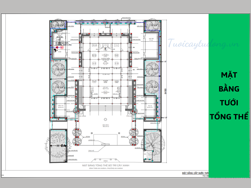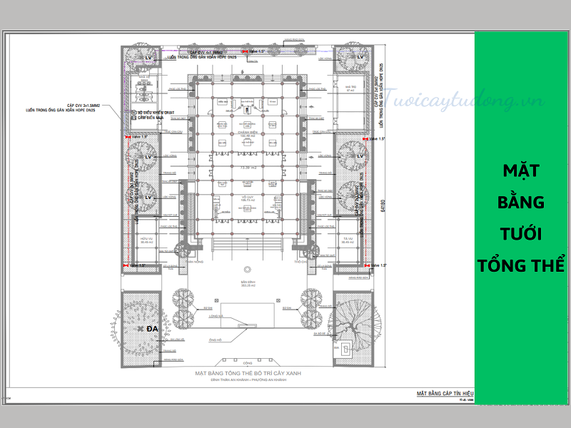 Hệ thống tưới đáp ứng nhu cầu tưới cho sân vườn cực rộng, bố trí đầu tưới cỏ, đầu tưới rotor, đầu tưới chữ nhật cho dự án.