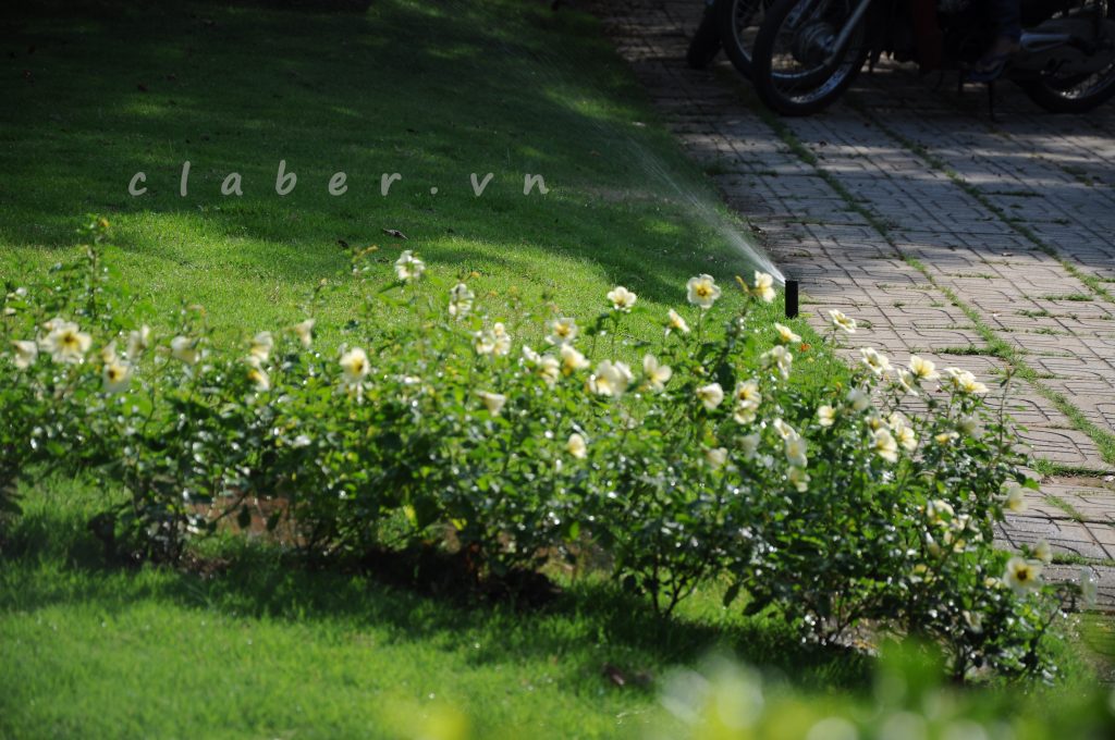 Đầu phun Rotor đang chăm sóc cho rặng hoa dọc lối đi.