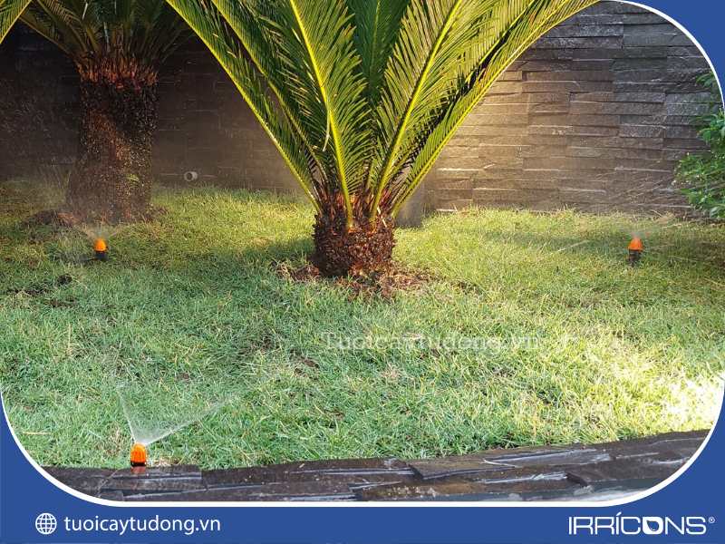 - Khu vực tiểu cảnh: Ở đây được trồng chủ yếu là cỏ và cây bụi. Tổng diện tích chỉ khoảng 10m2. Vì vậy, loại béc tưới được sử dụng là béc phun mưa tưới gốc micro với góc tưới 900 kết hợp với béc phun sương 3600 có chân cắm.