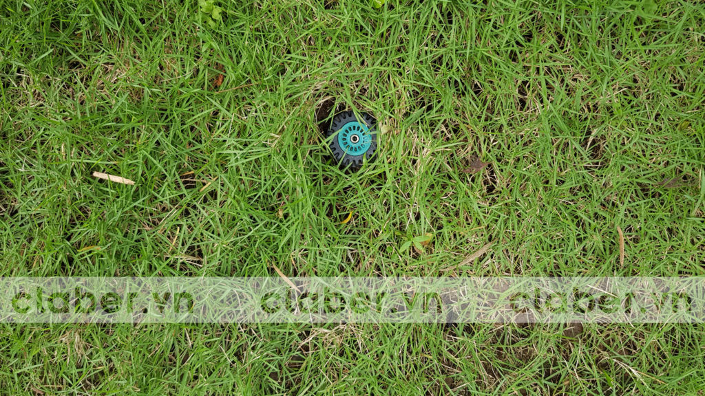 Đầu béc tưới phun mưa pop-up nằm yên trên thảm cỏ.