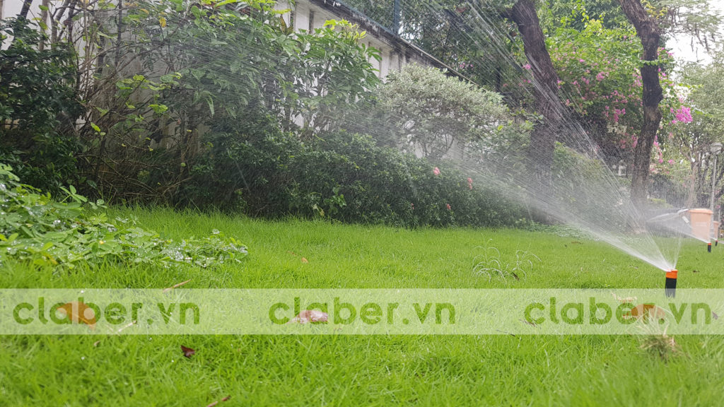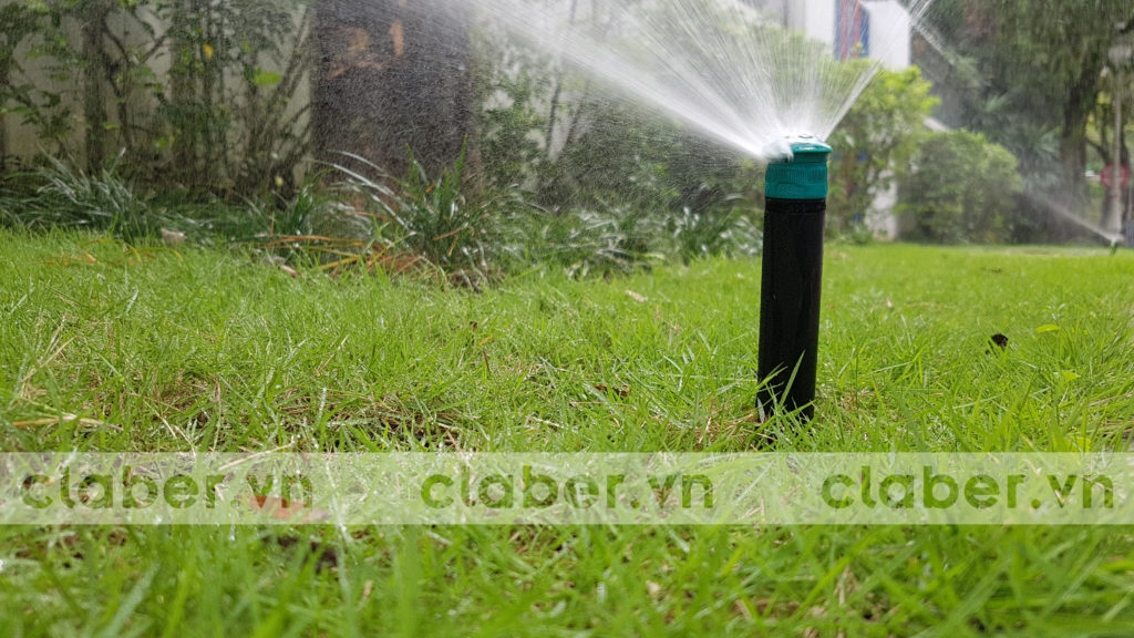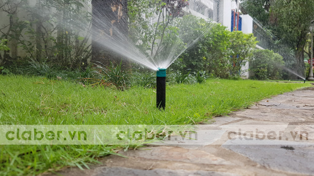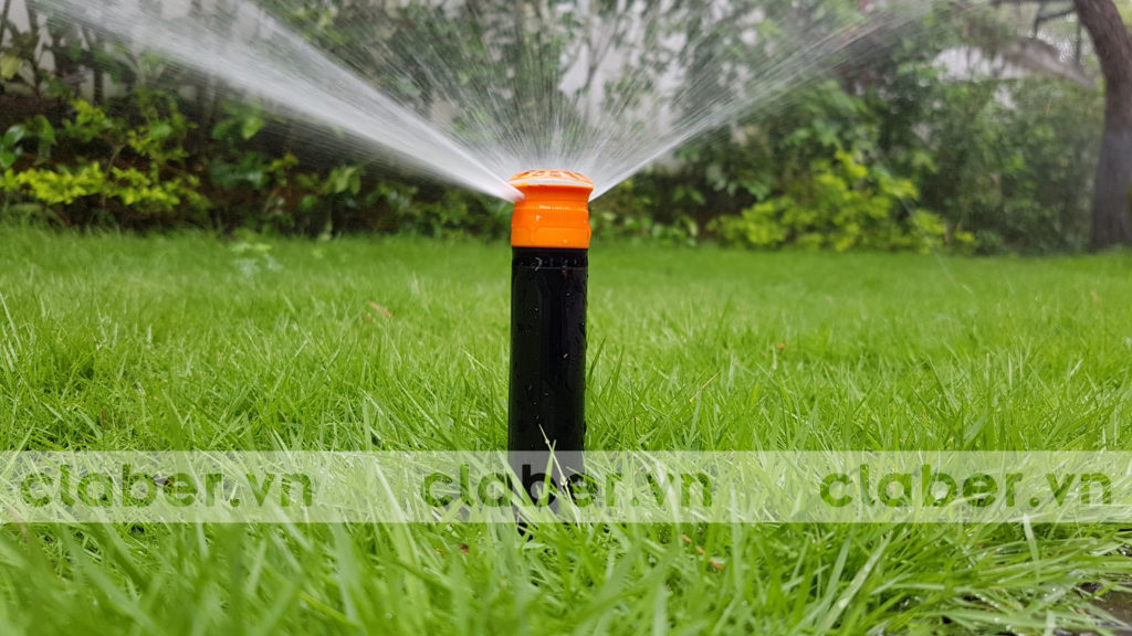 Béc tưới phun mưa Claber đang hoạt động – góc nhìn từ trên xuống.