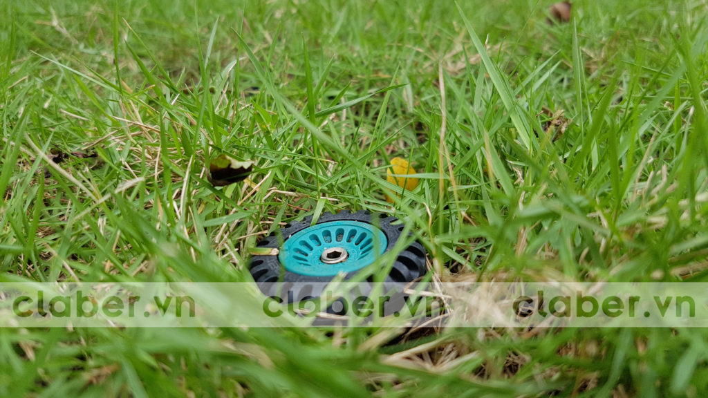 Tò mò đến gần nhìn kĩ hơn, sẽ thấy các đầu béc này rất tinh xảo. Nếu tình cờ giẫm lên, cũng đừng lo lắng. Hàng Claber bền lắm, chẳng lẽ không chịu nổi một bước chân? Nhưng hạn chế để con bạn nghịch các đầu phun nhé.
