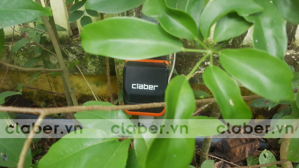 Hướng mắt vào trong lùm cây, ô cái máy gì thế kia? Là bộ timer hẹn giờ tưới tự động Claber đấy. Timer chạy pin, không dùng điện, cực kì an toàn cho trẻ nhỏ. Timer của Claber lại tích hợp cả van điện từ bên trong, chỉ cần gắn vào vòi nước là chạy. Không cần lắp đặt phức tạp.