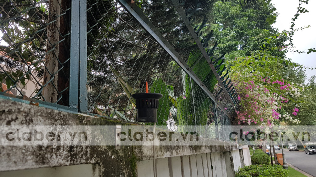 Nhìn lên bờ tường ngay phía trên mỗi timer, a có cái gì đó trông như cái phễu. Thật ra đó là cảm biến mưa có dây Claber. Mỗi khi trời mưa sẽ truyền tín hiệu để timer ngưng tưới. Cảm biến mưa kết nối dây, nên chỉ cần chọn một chỗ thoáng đãng, gần timer, đón mưa tốt.