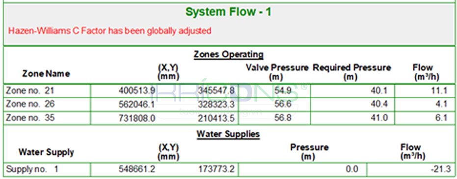 Valve Pressure (m) : Áp nước ngay tại vị trí van điện từ sau khi trừ đi tổn thất với áp nước được tra theo biểu đồ bơm ứng với lưu lượng của System Flow 1 là 21.3 m3/h (Tổng lưu lượng của 3 Zone 21, 26 và 35).