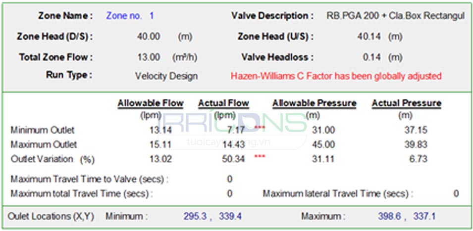 Outlet Location (Z, Y) : tọa độ vị trí áp thấp nhất và lớn nhất theo tọa độ trên phần mềm Irricad và Autocad để kiểm tra.