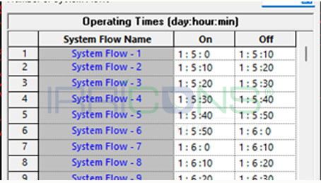 Hình bên dưới thể hiện thẻ lưu lượng của System Flow từ 1 đến 29. Ta có thể thấy, với thời gian tưới là 10 phút mỗi System Flow thì cần khoảng 290 phút để tưới hết 37 van điện từ của dự án này.