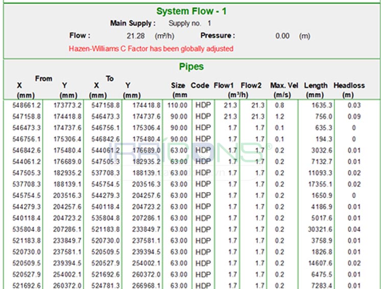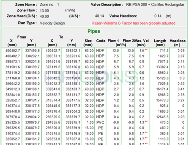 - Max. Vel : Vận tốc đoạn ống đang tính toán. Dấu “**” thể hiện vận tốc ống đang lớn hơn vận tốc đã chọn để tính toán là 1.2 m/s. Tổn thất các đoạn này không nhiều nên có thể giữ nguyên đường kính ống đã chọn. Do các đường ống PE là Lateral Pipe và được chọn sẵn khi thiết kế nên có vận tốc ống lớn hơn vận tốc ống đã chọn.