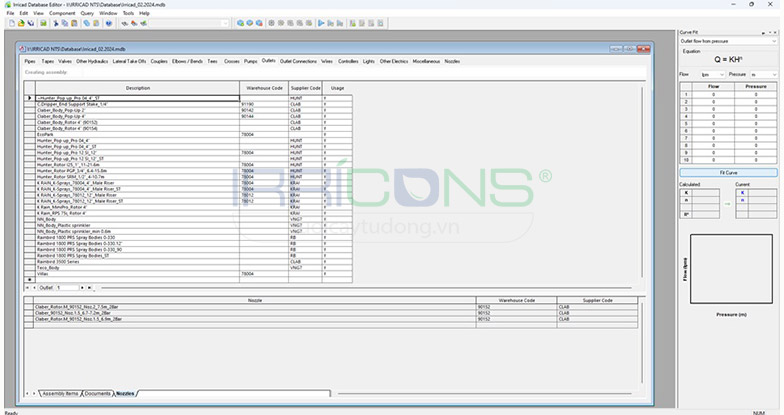 Bảng Irricad Database Editor dùng để nhập thông số thiết bị tưới.