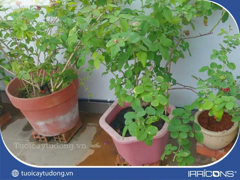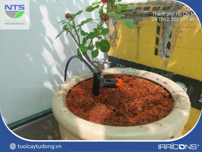 Chậu hoa hồng sau khi được lắp đặt béc tưới nhỏ giọt