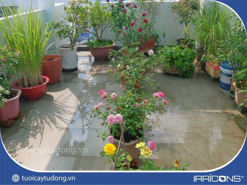 Hôm qua, NTS vừa hoàn thành xong hệ thống tưới cây tự động cho nhà khách tại Tân Phú, Hồ Chí Minh. Hệ thống tưới được lắp đặt cho vườn mái. Khu vực này có diện tích khoảng 15 mét vuông. Cây được trồng trong các chậu sứ, xếp theo hàng vô cùng ngăn nắp, gọn gàng. Tại đây, đa số khách hàng trồng hoa hồng, cây trà. Ngoài ra cũng có thêm một vài loại cây khác như chanh, sả, ngò gai, …
