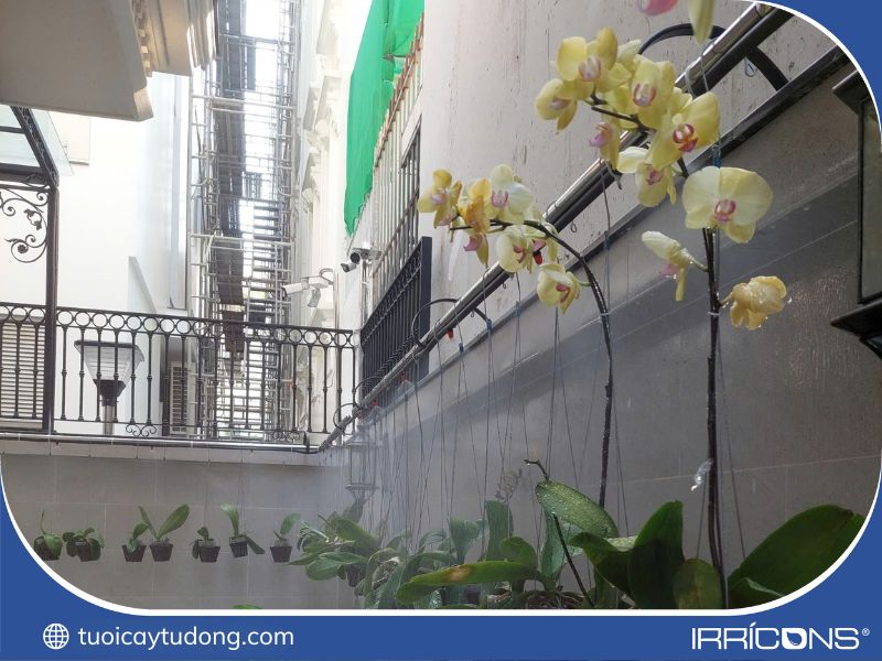 Với cây lan, hệ thống tưới phun sương chính là giải pháp tưới lý tưởng nhất. Béc phun sương cung cấp nước mịn, đều, nhẹ nhàng cho cây. Các béc tưới được lắp đặt để tưới từ trên xuống, giúp cho những cây cảnh bên dưới lan cũng đồng thời nhận được lượng nước tưới phù hợp.