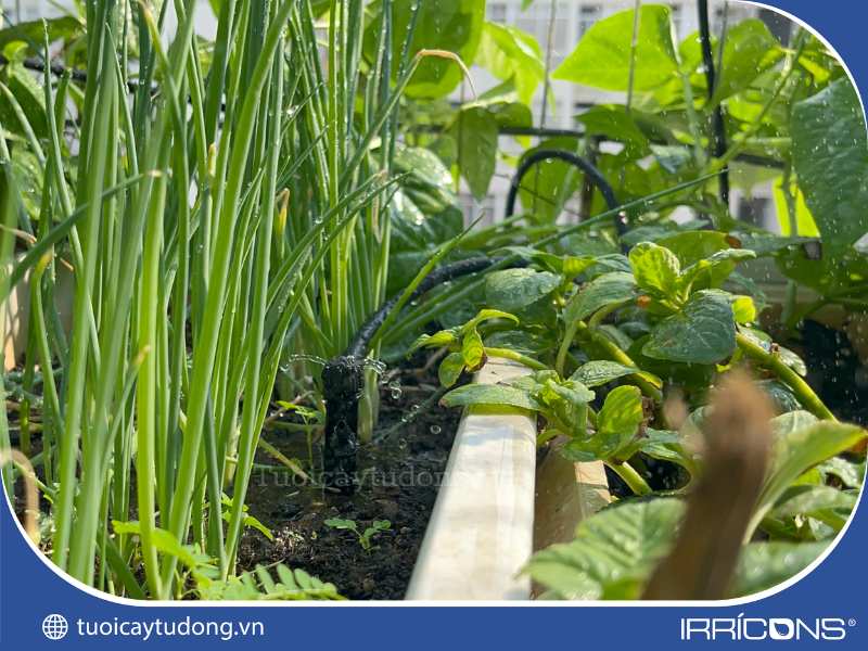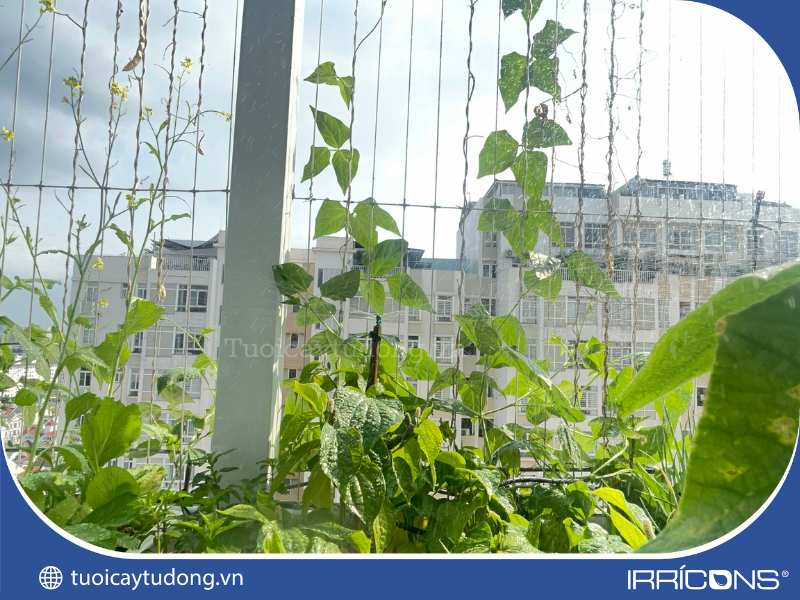 Ban công nhà khách rộng. Do đó, khách hàng có thể bố trí nhiều chậu cây khác nhau. Trong đó trồng chủ yếu là các loại rau như hành, mùng tơi, rau thơm, xà lách. Ngoài ra khách hàng còn trồng thêm một vài cây cảnh như hoa hồng, hoa mười giờ. Với mô hình trồng cây này, một hệ thống tưới cây tự động nhỏ giọt cho ban công sẽ rất phù hợp. Do đó, NTS đã thống nhất với khách hàng sẽ lắp hệ thống tưới theo phương án như sau: