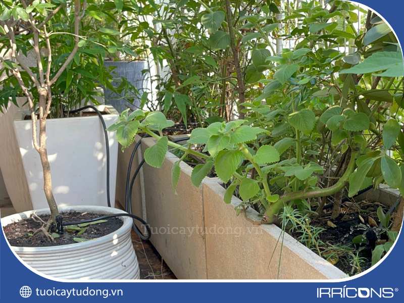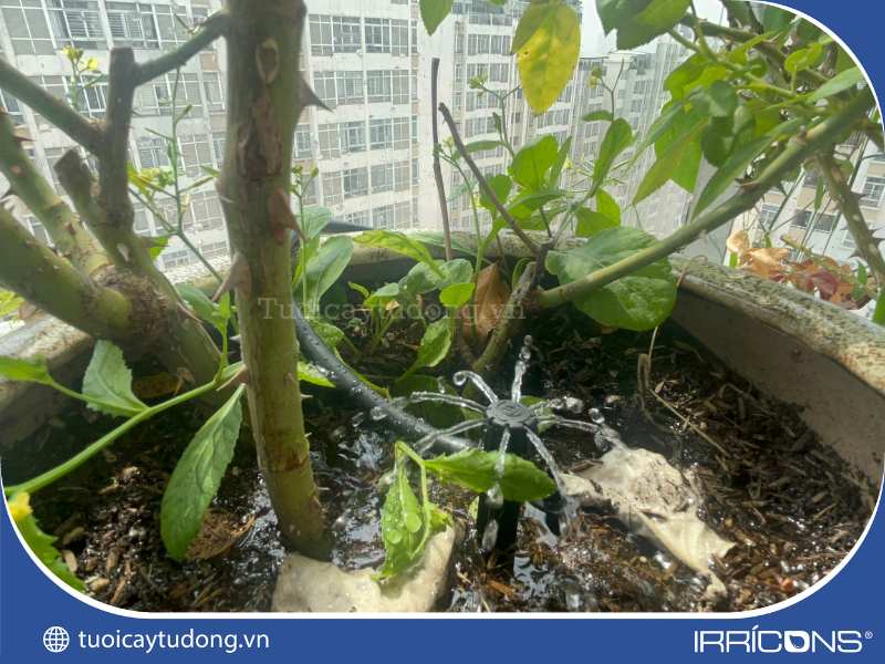 Béc nhỏ giọt đang tưới cho các chậu đặt tại ban công