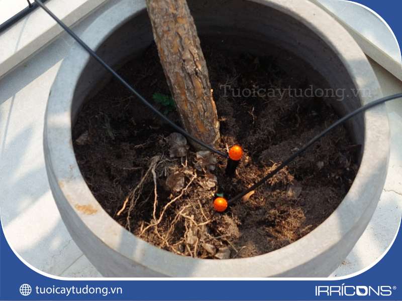 Béc tưới nhỏ giọt 8 tia được lắp đặt cho một chậu cây để tưới gốc lớn