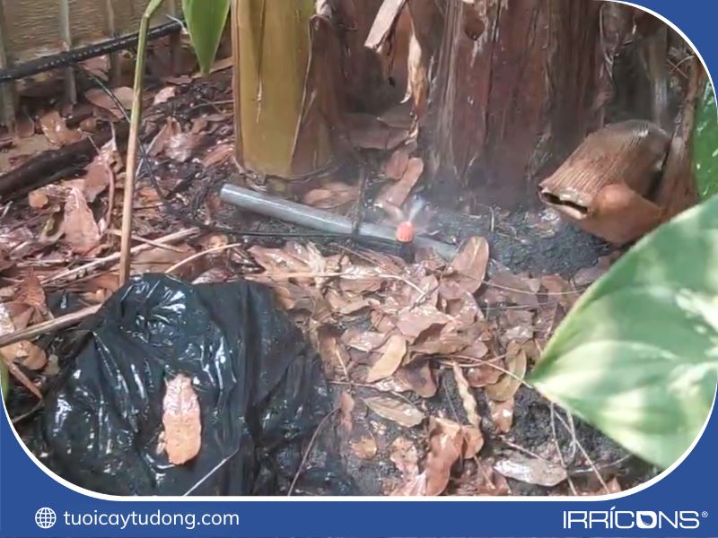 Béc phun sương đang tưới cho gốc chuối trồng trong sân vườn
