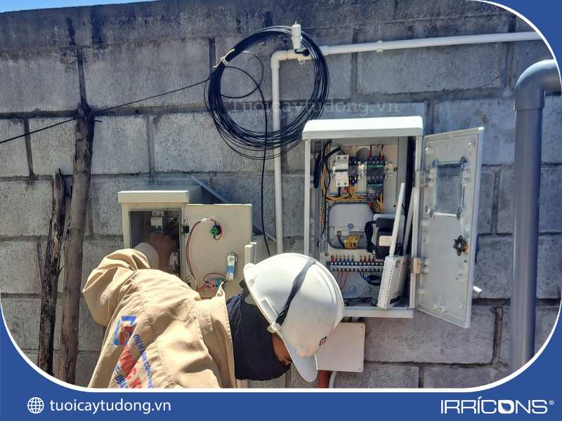 Kết nối dây dẫn điện cho tủ điều khiển hệ thống tưới cây tự động