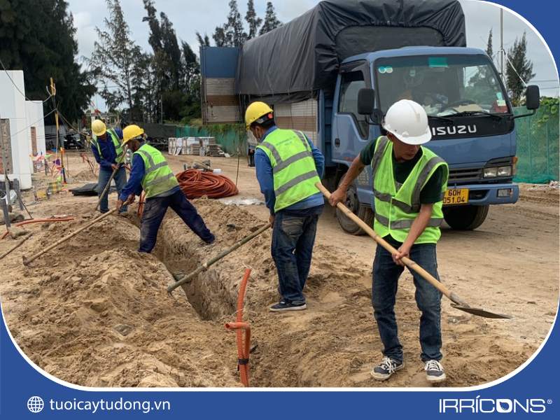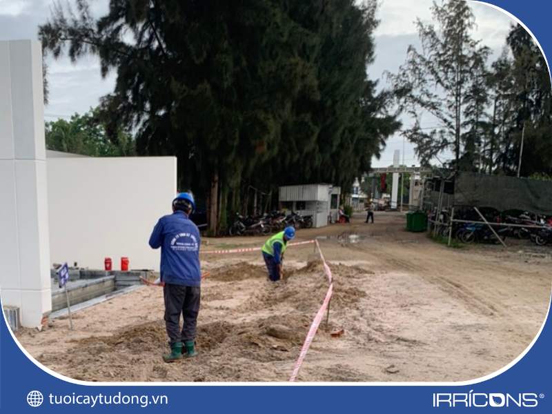 Đội ngũ thi công hệ thống tưới cây tự động đang tiến hành đào dất đặt đường ống nước