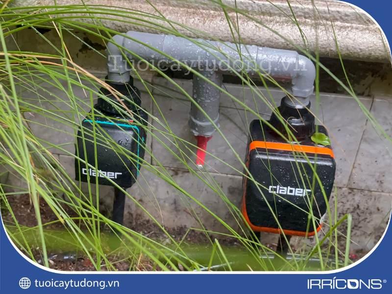 - Timer thứ nhất chúng tôi đã lắp đặt là bộ hẹn giờ loại 8410 của Claber, một thiết bị nổi tiếng về độ tin cậy và hiệu quả. Bộ hẹn giờ này có hai đầu ra, cho phép điều khiển hai kênh tưới riêng biệt, mỗi kênh tưới phục vụ một khu vực khác nhau trong vườn. Nhiệm vụ của nó là tự động bật và tắt nước cho các béc tưới cỏ. Mỗi đầu ra có thể điều khiển đồng thời 3 đến 4 béc tưới, đảm bảo rằng toàn bộ thảm cỏ luôn được cung cấp đủ nước một cách đều đặn và chính xác.