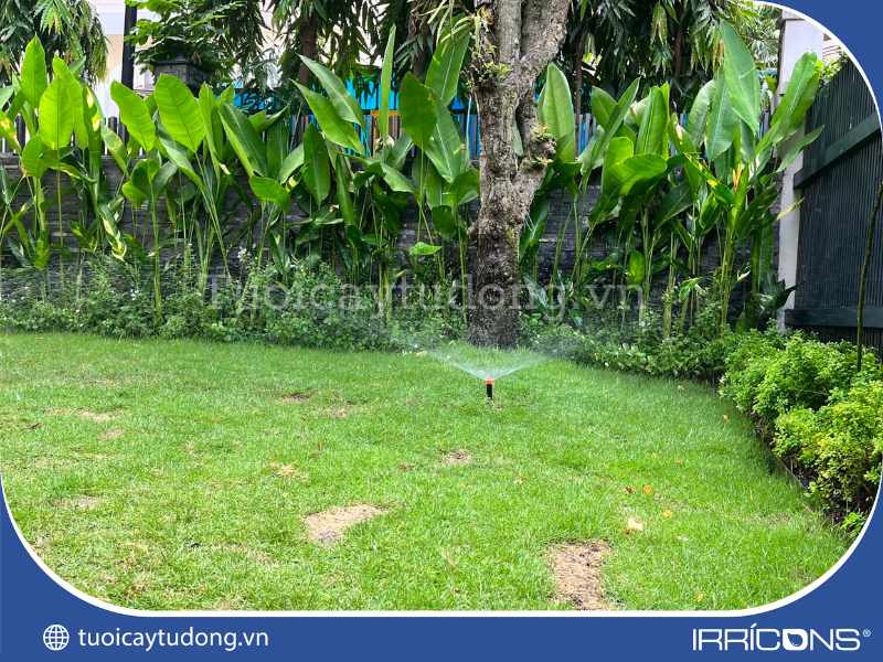 Khu vườn nhà khách đa dạng về cây trồng, điều này đòi hỏi hệ thống tưới cây cũng phải phong phú theo. NTS đã lựa chọn các loại béc tưới phù hợp với từng khu vực: béc phun mưa popup dành cho thảm cỏ xanh mướt, béc tưới nhỏ giọt cho các bồn hoa rực rỡ, và béc phun sương chân cắm cho những khóm cây bụi. Nhờ đó, mọi góc vườn đều được chăm sóc chu đáo, duy trì vẻ đẹp tự nhiên và sự tươi tốt.