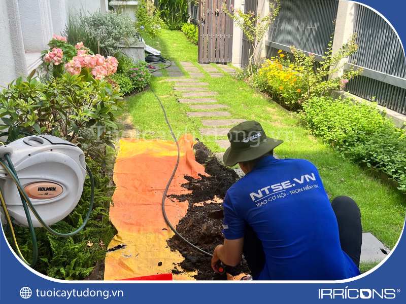 Khi nhận được yêu cầu từ khách hàng, NTS đã nhanh chóng sắp xếp thời gian và đến tận nơi để bắt tay vào lắp đặt hệ thống tưới cây tự động. Quá trình thi công được tiến hành một cách tỉ mỉ và chuyên nghiệp, đảm bảo hệ thống hoạt động hiệu quả và bền bỉ. Hệ thống tưới cây được lắp đặt như sau:
