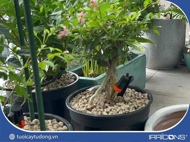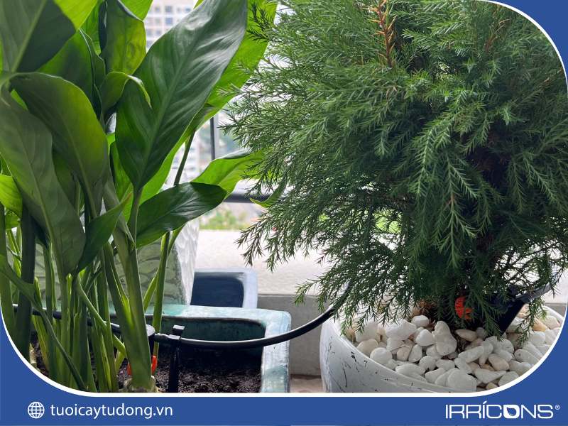 - Tưới đều và đủ cho cây lớn: Đối với các chậu cây lớn, chúng tôi đã quyết định lắp đặt 2 béc tưới cho mỗi chậu, đảm bảo rằng toàn bộ cây trong các chậu đều được tưới nước đều đặn, không bị thiếu nước.